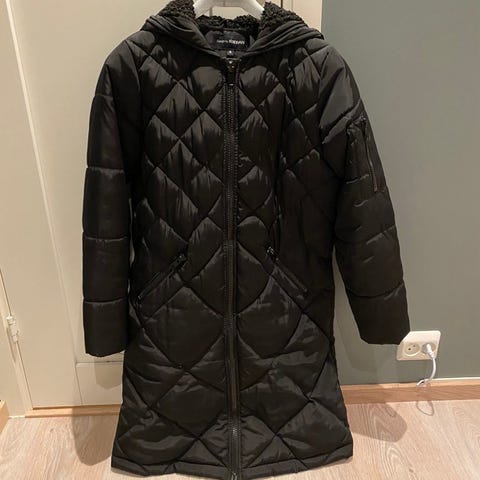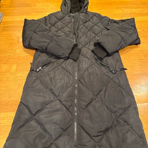 Lang jakke ( rekker til ca ankelen på meg som er 164 cm.Str M (stor i str) fra Kappahl. Veldig myk og god med dype lommer, og knapper nederest
