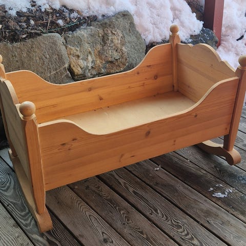 Køyeseng i furu, for dukker. Dukkeseng.