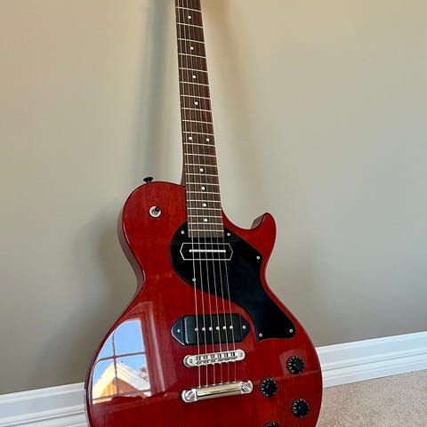 Flott Gibson LP Studio fra 1997 i vinrød med gator case. Selges fordi jeg flytter til Svalbard og det bare er dumt å la et så fint instrument ligge urørt i 3 år. Noen merker her og der og tapet forsiktig på baksiden for å beskytte mot beltespenna.