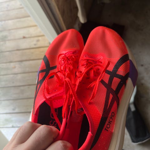 Asics metaspeed sky løpesko i størrelse 46 med rød farge. Skoene er designet for løping og har en lett og pustende overdel. Sålen gir godt grep og støtdemping for løpeaktiviteter.