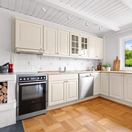 Kjøkkenet er tilpasset innbygging av kjøleskap og vaskemaskin i tillegg til hvitevarene nevnt over.
