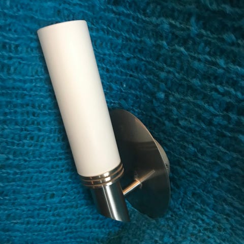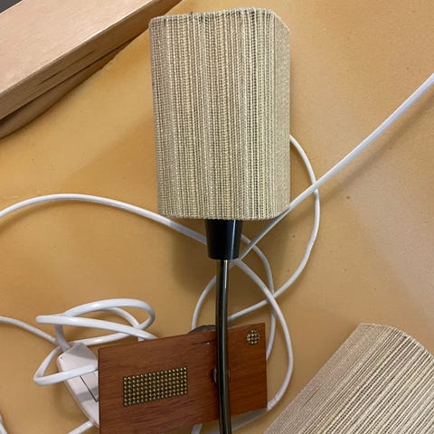 Vegglampe med ca 140 cm lang arm. Festebrakett 18 cm x 8 cm. Hode ca 20 cm.