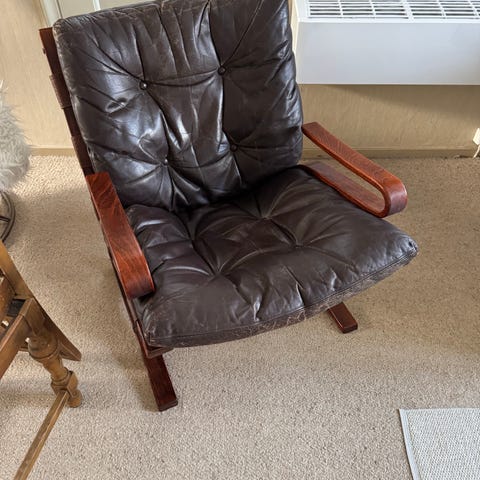 En nett lite lenestol. Stolen er i bøk med blått ullstoff