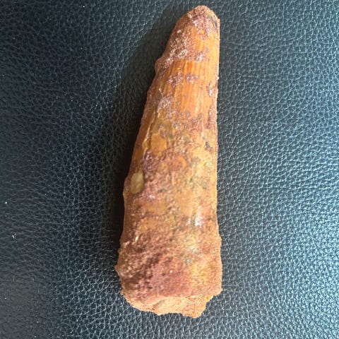 Ekte tann fra Suchomimus tenerensis, en fiskespisende rov dinosaur nært beslektet med Spinosaurus. Fossilet er funnet i Niger og er ca. 5 cm langt. Suchomimus levde for rundt 112 millioner år siden i krittperioden og hadde lange, smale kjever fylt med koniske, skarpe tenner tilpasset jakt i elver og våtmarker.