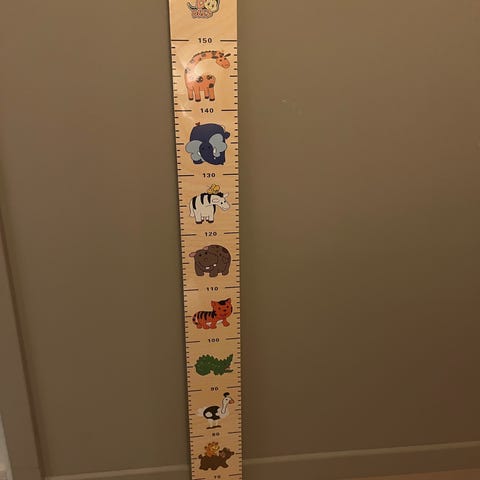 Helt ny høydemåler til barn i tre. Fått i gave, men ikke brukt.