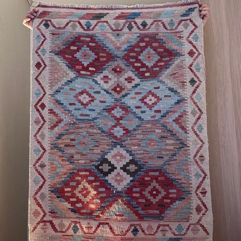Håndlaget vevd ullteppe som kan brukes på begge sider. Det er lett å rengjøre med støvsuger. og er slitesterkt.