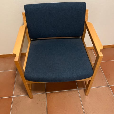 En nett liten lenestol. Stolen er i mørk tre med rotting i ryggen. Stoff i sete. En kjekk suplering stol