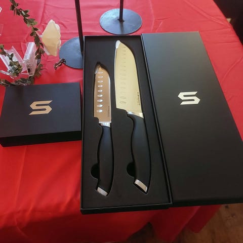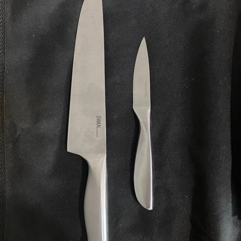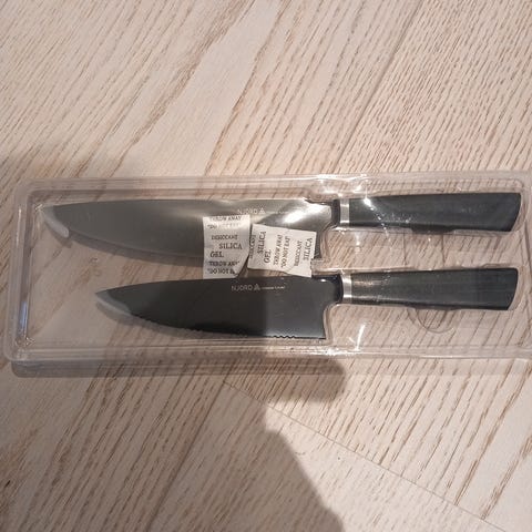 Tre gode kjøkkenkniver, merke Paul Bocuse. Kokkekniven har et blad på 20 cm, det samme har brødkniven, og den mindre kniven er 12 cm lang.