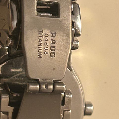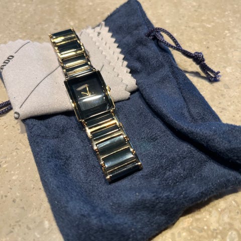 Rado dameklokke med svart rektangulær urskive og metall lenke. Klokken har en minimalistisk design med tydelige markører på urskiven. Egnet for daglig bruk og formelle anledninger.