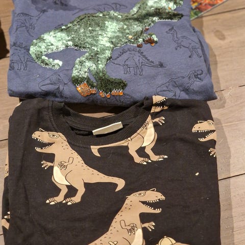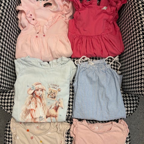 En pakke med fine sommerklær til bomull i størrelse 110-116, 5-6 år, perfekte for daglig bruk. Noen bruksmerker, generelt i god stand. Én shorts i 110 og én i 116. Selges samlet