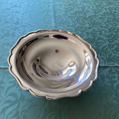 Sølvskål plassert på en fot med en dekorativ kant rundt åpningen. Skålen har en rund form og er laget av sølv. Egnet til servering eller som dekorativt element.
