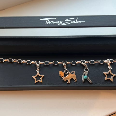 Jeg selger charm-armbånd med flere anheng av Thomas Sabo charm club i sterlingsølv siden den ikke blir brukt nok. Kun prøvd på en gang.