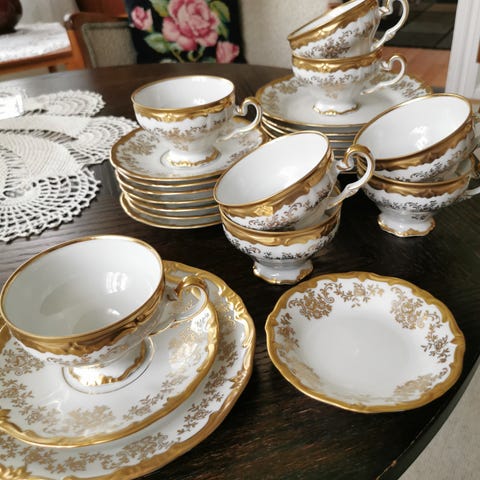 Nydelig vakkert kaffeservise for 10 personer som jeg håper noen kan ta i bruk, slik det fortjener.
