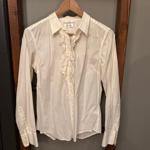 Filippa K hvit skjorte i dobby-vevd bomull. Klassisk, lett struktur og tidløs passform, str L