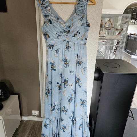 Pen sommerkjole til bryllup/sommerfest osv. selges. Skulle brukes til sommerbryllup, men passet ikke over bysten dessverre (jeg har D-cup). Kjolen er fra JJs House og koster 2418 kr ny. Nydelig kjole med innebygd padding over bysten, som sitter flatterede og har en nydelig farge. https://www.jjshouse.com/no/product/a-line-kjole-v-hals-gulvlengde-chiffon-kjole-til-brudens-mor-med-brusende-volanger-008312298-g312298