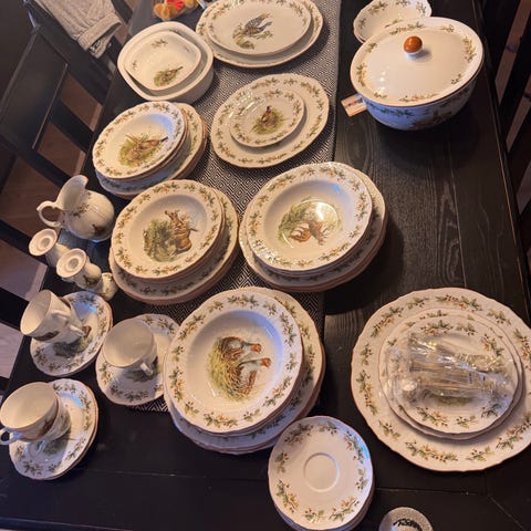 Nydelig middag service til 6 personer med jakt motiv i perfekt stand, uten noen merker eller skader.