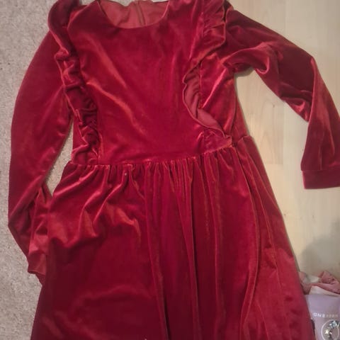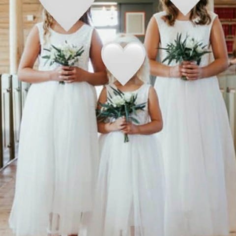 Hvit blomsterpike-kjole med strikk i størrelse 140 selges.