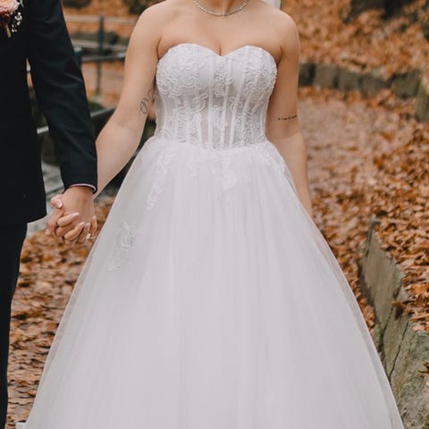 Pen brudekjole kjøpt i 2022 for 17.000kr. Snøring bak i ryggen som gjør størrelsen fleksibel. (Jeg er 163cm og størrelse M).