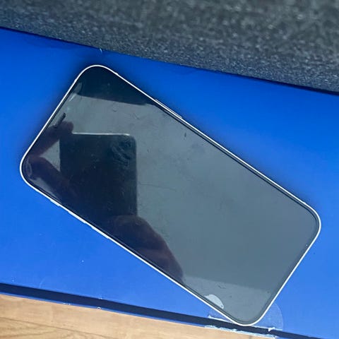 Apple iPhone 13 Pro mobiltelefon med 128 GB lagringskapasitet. Telefonen er i mørkeblå farge. 2 av linsene på kameraene bak er knust. Telefonen lager en vibrasjons lyd når man bruker bak kameraet på 1x zoom. Gode deler av baksiden er knust men funker som den skal. Mulig man må kjøpe nytt kamera til mobilen.