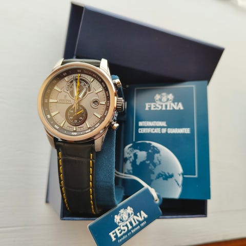 Festina herreklokke med brun rem og gullfarget urkasse. Klokken har flere funksjoner synlige på urskiven og leveres i original eske med bruksanvisning.