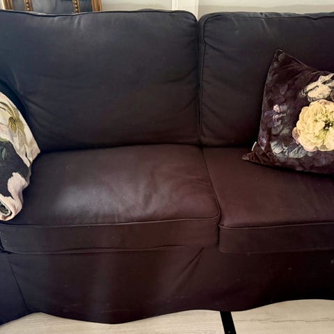 Veldig flott rustoransje sofa. Kjøpt ny sommeren 2022. Det er en del knapper i sofaen som har løsnet, da de har hengt seg fast i klær og lignende (se bilder), men jeg har alle fortsatt, så de følger med. Utover det så er den solid og god å sitte i, og putene har stort sett holdt formen, selvom det kan merkes at den har blitt brukt i 3,5 år. Ingen dyr eller røyk. Selges på grunn av flytting. Se profil for mer.