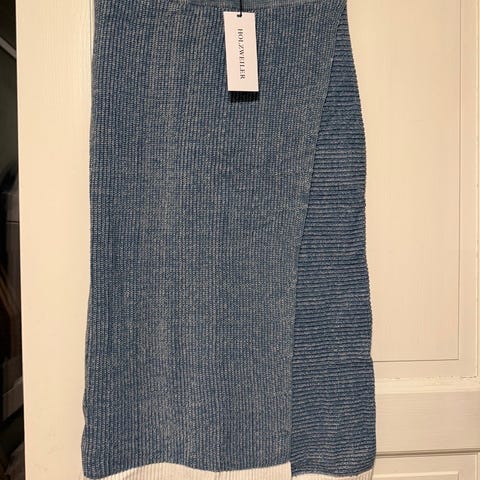 Holzweiler skjørt i beige farge, størrelse L for kvinner. Skjørtet har lommer og belte med sølvspenne.