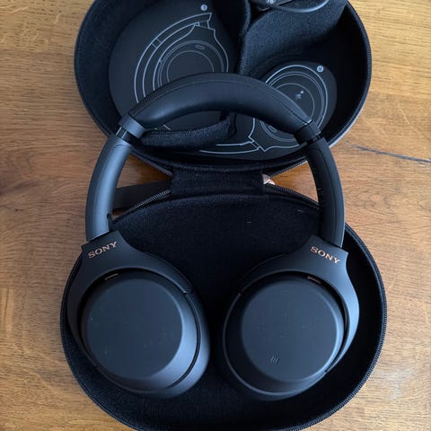 Sony WH-1000XM4 hodetelefoner i svart farge. Over-ear design med polstrede øreputer. Trådløs tilkobling med aktiv støydemping. Justerbar hodebøyle for komfortabel passform.