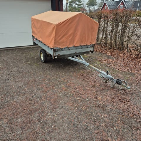 Brenderup 3205s tilhenger. 1000kg totalvekt, nyttelast 815kg. Kan kjøres med B sertifikat med de fleste personbiler. Med ekstra karmer. Nye baklys. Nye bremser. Nytt stempel på draget. La nytt dekke for noen år siden, trykkimpregnerte bord. Tilhenger er heilt i orden. Litt sink slipp rundtom. Litt overflate rust. Kjøpt ny av meg 2009. Bruken siden 2009 er normal privat bruk. Stått for det meste ute. Men jevnlig brukt.