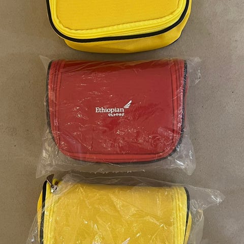 Ubrukte amenity kits Lufthansa First class, United business og SAS business.