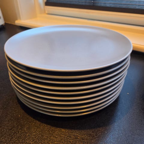 IKEA tallerken- og bollesett bestående av flere tallerkener og boller i lys grø farge. Passer til daglig bruk i kjøkken og spisestue.