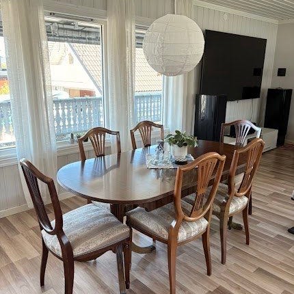 To av de 8 stolene er med ermlener (for endene av bordet). Disse er ikke vist på bildet.