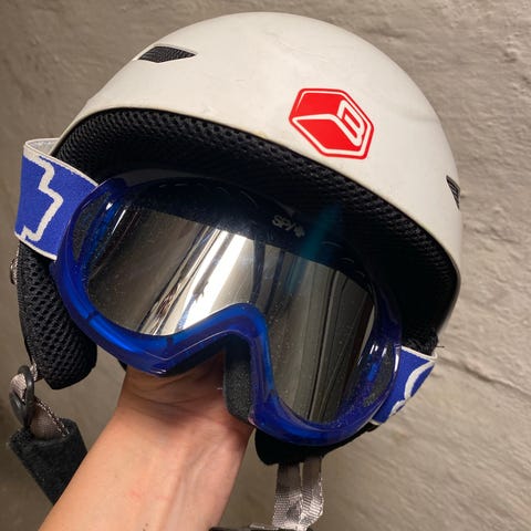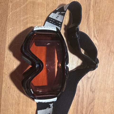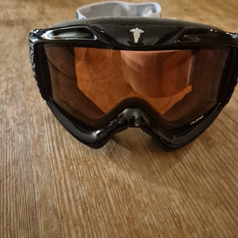 Dr. Zipe skibriller med grønt justerbart stroppbånd og bruntonede linser. Brillene har polstret innside for komfort og hvite detaljer på stroppen. Er noen bruksmerker og på ene bildet kan man se polstringen begynner å gå litt i oppløsning men fungerer fortsatt helt fint!