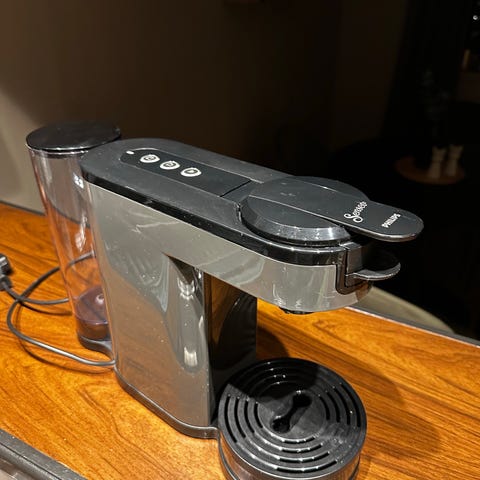 Pent brukt kaffemaskin som lager god kaffe og melkedrikker. Den kan også gi varmt vann til te osv.