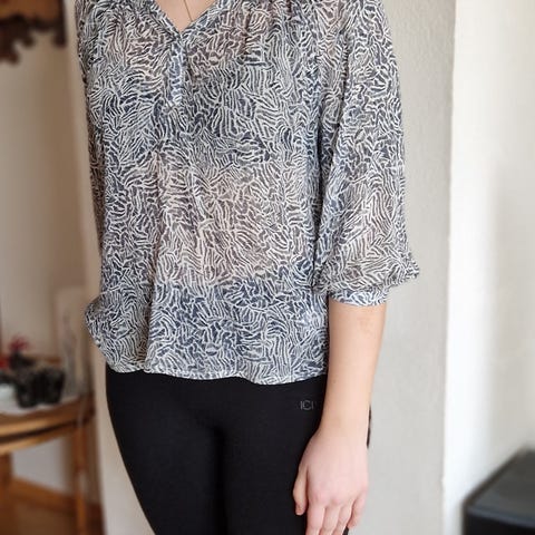 Tynn flerfarget topp med detaljer i front. Str. M, knyting i front. Pent brukt, ingen skader.