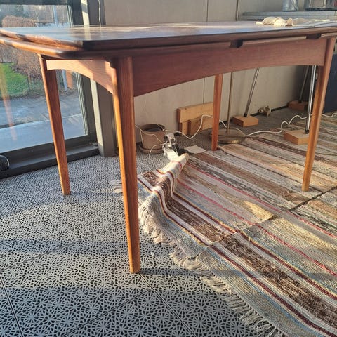 Teak bord, heltre med 2 ileggsplater. fra 60 tallet. 4 stoler med brunt trekk følger med. Trenger litt kjærlighet men ingen store skader. Stolene er stabile og trekket helt. Bud