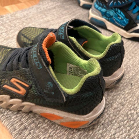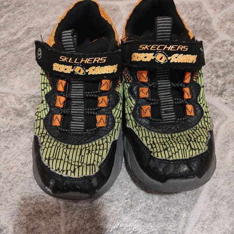 Skechers S-Lights joggesko for gutt i størrelse 28. Skoene har svart og oransje farge med lysdetaljer, og er designet for barn. De har borrelås og elastiske snøringer for enkel på- og avkledning. Lys/blinking fungerer.