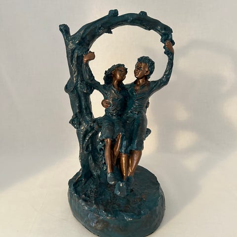 Fin, vintage, bronse figur av en afrikansk? kvinne og mann, og en puddel, hund. Statue er laget av bronse. Skulpturen viser detaljerte figurer med en brun, rustikk finish. Ukjent opprinnelse. Tung og stødig.