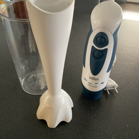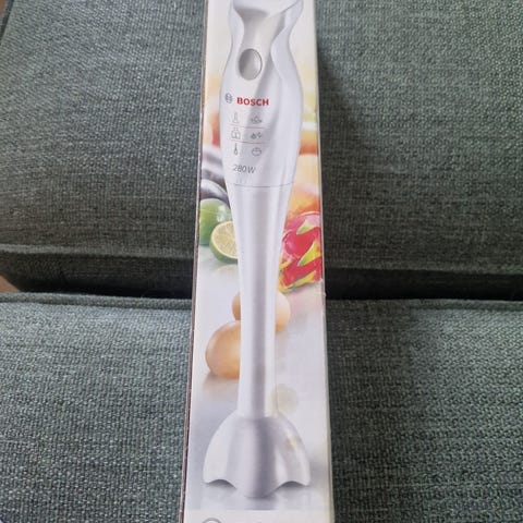 Point stavmikser med tilbehør som visp og hakker. Elektrisk kjøkkenutstyr med ledning, egnet for miksing, visping og hakking av ingredienser i matlaging.