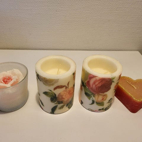 Stor pakke med dekorative lys — inkludert 4 store telys, 12 små telys, noen kubbelys med kyllingmotiv, ett lite duftlys og ett større duftlys. Alle lysene er helt nye, ubrukte og med lapp, og passer perfekt til dekor, vårstemning, borddekking eller som gaveidé.