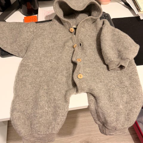 Nøstebarn ull genser i størrelse 74 for barn, unisex. Genseren er grå og laget av ull, med knapper foran og hette.