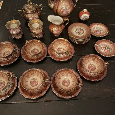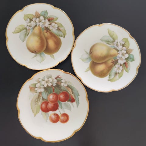 Pent sett med 4 desserttallerkener/asjetter fra Bavaria (Tyskland). Klassisk druedekor med gjennombrutt kant og gullstaffering. Alle tallerkenene hører sammen og har samme stempel.