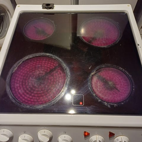 Gram keramisk komfyr med keramisk kokeplate. Komfyren har flere betjeningsknapper for justering av varme og funksjoner.