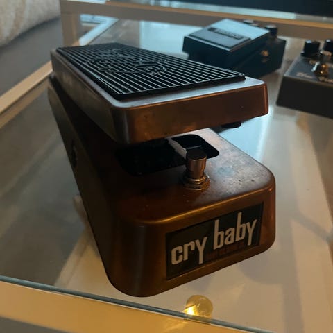 Vox wah-pedal. Pedalen er laget for å endre gitarens lyd ved å variere frekvensresponsen, noe som gir karakteristiske wah-lyder. Den er utstyrt med en fotpedal for manuell kontroll og har tilkoblingsporter for gitar og forsterker.