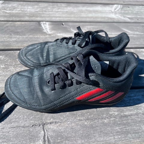 Adidas fotballsko i rød farge, designet for barn. Skoene har borrelås og snøring for justerbar passform. Sålen er utstyrt med knotter for bedre grep på gress og kunstgress.