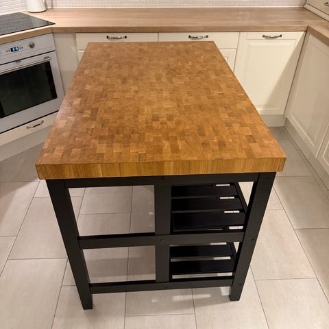 Kjøkkenøya er helt som ny - ingen bruksmerker. Vi har i praksis ikke brukt den som noe annet enn et avlastningsbord, så den har ikke vært utsatt for varme eller fuktighet eller annet man typisk bruker en kjøkkenbenk til. På den ene kortsiden har vi skrudd opp en praktisk knaggrekke, men denne kan enkelt skrus ut hvis man ikke ønsker å ha den.
