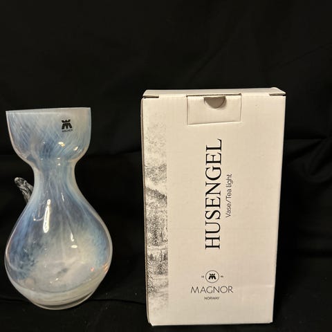 Magnor Glassverk Husengel vase laget i glass. Produktet har en unik form med blå og hvite fargetoner. Kan brukes til svibel og telys. 20 cm høy. Jeg har ikke kvitteringen.