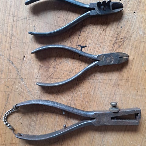 Samling med ulike tenger og avbitere i forskjellige størrelser og typer. Inneholder kombitang, spisstang osv. Perfekt for verksted, restaurering eller delelager. Brukt, med patina, men fullt brukbare. Selges samlet. 🔧