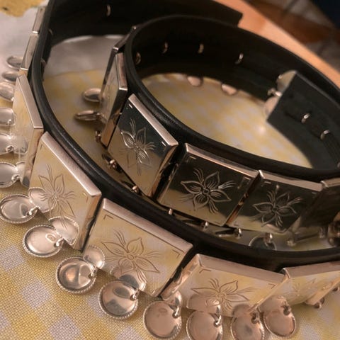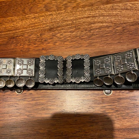 Bunads sølv. Vestfold sølv. Belte er til størrelse smal . Det er 20 beltestøler , pluss spenne. Stor sølje, mansjett knapper , øreanheng og hals sølje.