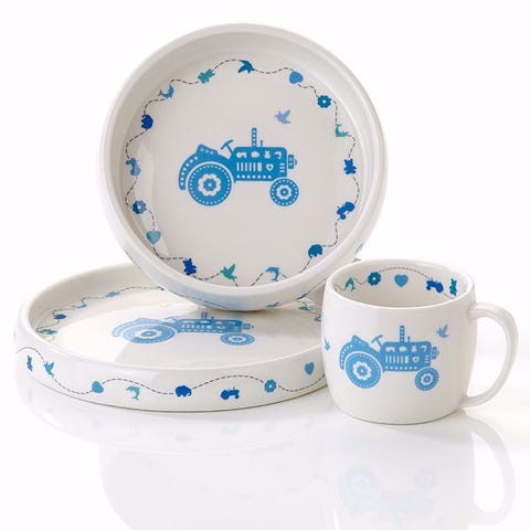 «Flott barneservise i porselen bestående av tallerken, grøtskål og kopp. Fin dekor med traktor-motiv. Serviset tåler både mikrobølgeovn og oppvaskmaskin»