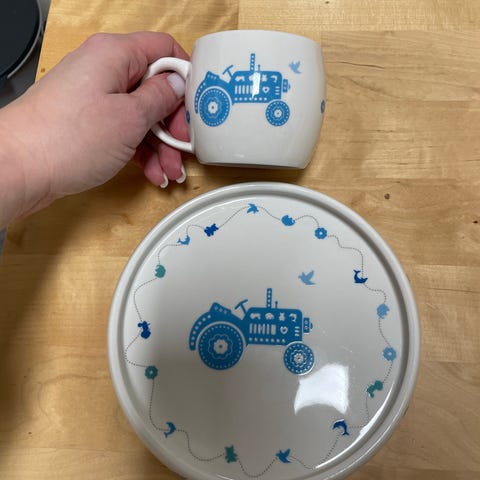 Barneservise fra Pia og Per, pent og lite brukt. Motiv: blå traktor